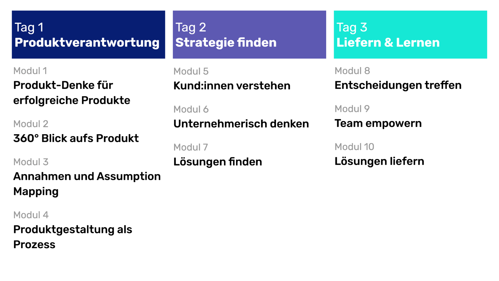 Blick ins CurriculumMaßgeschneiderte Team-Workshops für Produktstrategie, Discovery und Outcome-Orientierung.